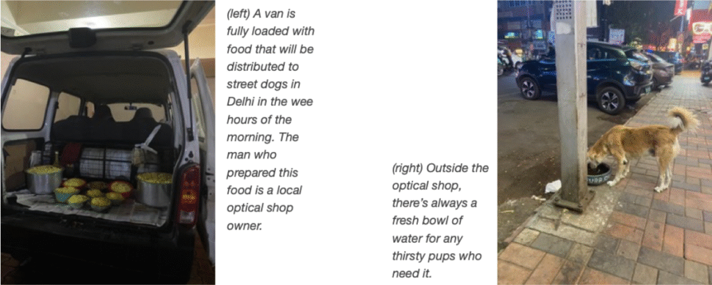 In pockets of the country there are individuals who have mobilized to collectively provide care for Indies. Sometimes these are structured organizations but sometimes, as I learned from Kapil, it could equally be individual members of a Whatsapp group who organize care and/or distribute food for the dogs.